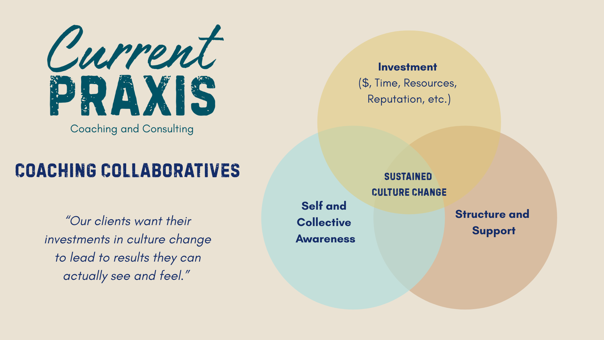 Coaching invites exploration, self-actualization, and action that aligns with a desired outcome or change. The Current Praxis restorative coach approach creates space for inclusive leaders to pursue new, preferred narratives.